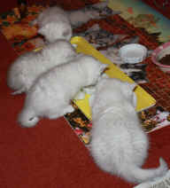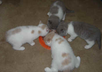 with a blanket and toy. Most kittens this year will be Champion sired by CH Petticote